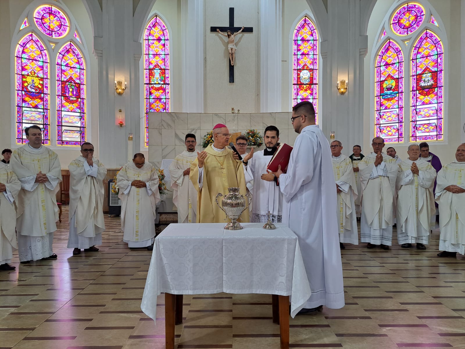 Na manhã desta Quinta-feira da Semana Santa, 28 de março, Dom Moacir Aparecido de Freitas, Bispo Diocesano, celebrou a Missa do Crisma, também conhecida como Missa dos Santos Óleos, na Catedral Nossa Senhora Aparecida, de Votuporanga. Esta Missa é marcada pela renovação das promessas sacerdotais e a benção dos óleos dos enfermos e catecúmenos e consagração do Crisma.