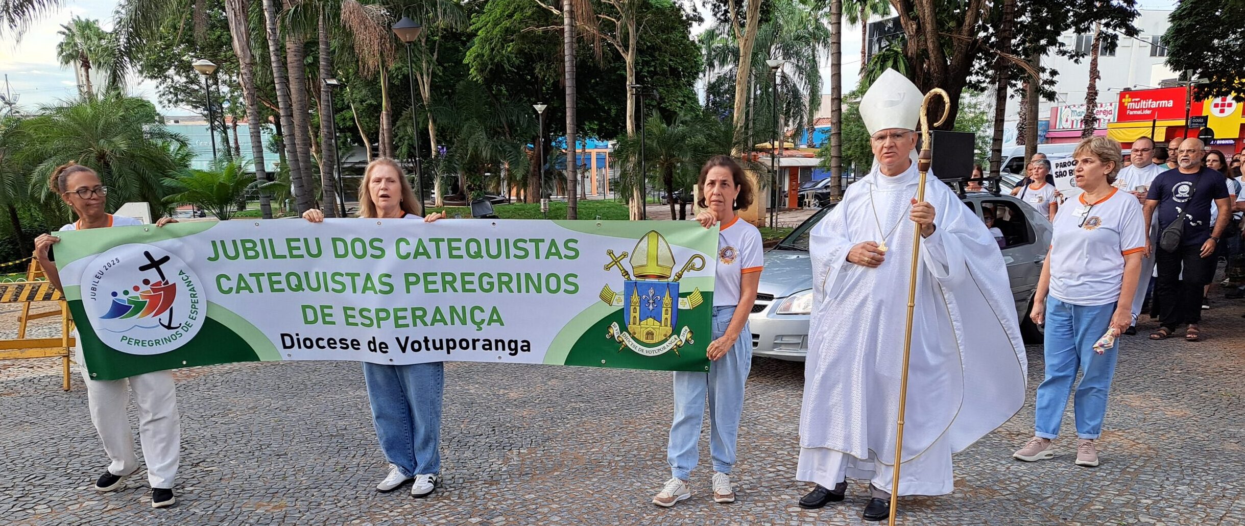 A Diocese de Votuporanga realizou no dia 1º de fevereiro o Jubileu dos Catequistas. O evento iniciou na Paróquia São Bento, com uma formação conduzida pela Irmã Rosangela Fontoura, buscando fortalecer a vocação catequética e motivando os presentes a assumirem com entusiasmo o chamado de evangelizar. Em seguida, com momentos de música e oração, os catequistas seguiram em peregrinação até a Catedral Nossa Senhora Aparecida, onde participaram da Missa presidida por Dom Moacir Aparecido de Freitas, Bispo Diocesano.